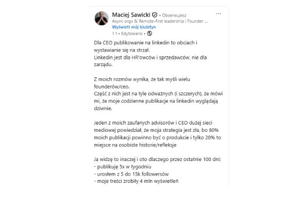 W B2B ludzie kupują od ludzi. Firmowy profil jest ważny, ale to profile osobiste pracowników tworzą poczucie prawdziwej relacji. To one dają twarz marce, pokazują sposób myślenia, poczucie humoru, wrażliwość na problemy rynku.